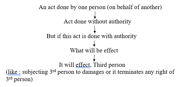 1. Act on behalf of another : In the first place, it is necessary that the act in question must have been done on behalf of the person who wants to ratify it. It is not necessary that he should be named but there must be such description of him.
