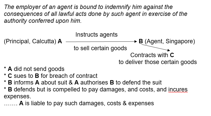 (a) B, at Singapore under instructions from A of Calcutta, contracts with C to deliver certain goods to him. A does not send the goods to B, and C sues B for breach of contract. B informs A of the suit, and A authorizes him to defend the suit. B defends the suit, and is compelled to pay damages and costs, and incurs expenses. A is liable to B for such damages, costs and expenses.